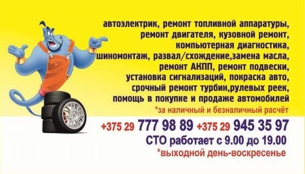 Продается готовый бизнес - СТО. Общая площадь помещения - 134 м2. Аренда до 2019 года с првом продления. Низкая арендная плата. Виды оказываемых услуг: - все виды слесарных работ - сварочные работы - шиномонтажные работы (в т.ч.развал-схождение) - кузовной ремонт, покраска авто, обработка днища - ремонт топливной аппаратуры - компьютерная диагностика и т.д. Высота ворот позволяет осуществлять ремонт микроавтобусов. В наличии имеется все необходимое оборудование. Доступ к СТО - беспрепятственный. Имеется система видеонаблюдения. Хорошее месторасположение. Высокий трафик автомобилей. Для работы имеется сертификат до 2020 года с полным спектром работ. Бизнес без долгов и кредитов. Имеются договора с Белгосстрах, УСК и многими частными компаниями. Более подробная информация по телефону или при личной встрече.