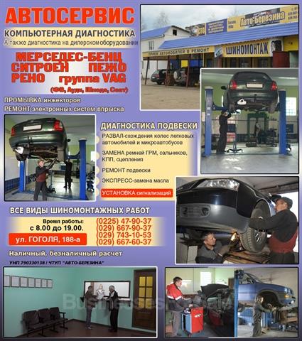 Продаётся СТО в г.Бобруйске по ул. Гоголя. площадь помещений 512 квадратных метров.Успешно налаженный бизнес (7 лет). ЧТУП,сертификат до 2016г. Пять рабочих боксов (6 подъёмников+4 ямы), магазин автозапчастей, комната для клиентов, бытовые помещения,котельная. СТО полного цикла: слесарка, токарный станок,развал-сходжение, компьютерная диагностика и ремонт, шиномонтаж, электрика. Все условия: персонал, клиентура. Цена договорная, при осмотре. Тел. +375297431053; +375296679037