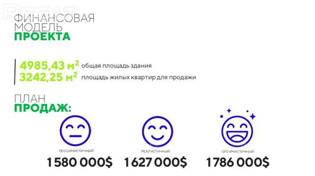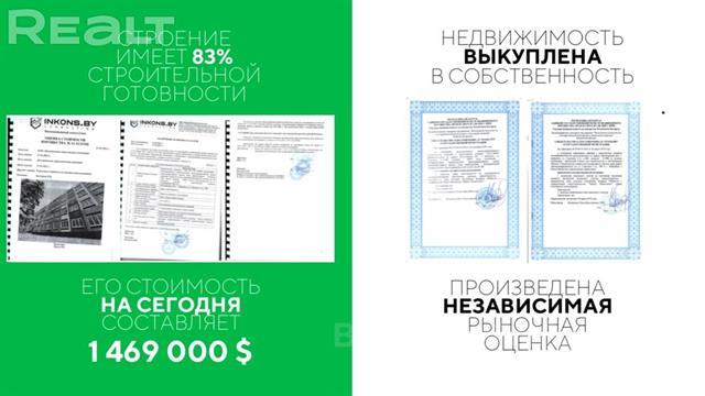 Изучаем спрос на продажу Здания 4 этажа. (Продажа здания или продажа компании или доли в ооо.) Назначение: Многоквартирный жилой дом. (Возможно изменение назначений под любые цели.) Причина продажи = необходимость досрочного исполнения обязательств компанией. Недвижимость находится в собственности `ООО` Произведена независимая рыночная оценка недвижимости, стоимость = 1 469 000$ Компания имеет в пользовании земельный участок, Кадастровая стоимость участка 208 800 $ Получены все согласования и разрешения для реализации проекта. Проект/Положительное заключение Госстройэкспертизы. / Строительная готовность здания 83%. Три сценария реализации помещений проекта: ПЕССИМИСТИЧНЫЙ: 1 580 000$ РЕАЛИСТИЧНЫЙ: 1 627 000$ ОПТИМИСТИЧНЫЙ: 1 786 000$
