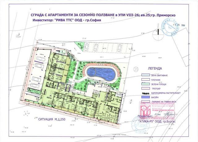 Представляем Вашему вниманию инвестиционный проект с видом на море, находится в городе Приморско в Бургасской области, на юго-востоке Болгарии, административный центр общины Приморско, недалеко от городов Созопол и Царево. Объект расположен на территории северного пляжа, расстояние до которого – 75- 80 м. Полоса пляжа включает в себя дюны и достигает ширины в 120м. Объект с северной стороны граничит с другим строением, с восточной стороны с пляжем, южная и западная стороны выходят на улицу. По проекту объект является самостоятельным комплексом, включающим в себя 52 апартамента площадью от 43 кв.м. до 83 кв.м., кафе 196 кв.м., на 50 мест с терассой 61 кв.м. на 40 мест, внутренний двор с бассейном и 20 местами для парковки, с западной стороны имеется 6 гаражей. В настоящий момент проект находится в стадии строительства, так же следует отметить, что объект продается с двумя комплектами проектов. Первый проект предусматривает строительство здания с апартаментами для сезонного пользования, а второй проект предусматривает строительство отеля. Этап, на котором строение находится на сегодняшний момент, разрешает использование любого из двух проектов представленных выше.