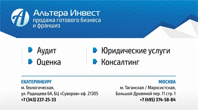 - Федеральная компания "Альтера Инвест" предлагает Вам ознакомиться с другими предложениями о продаже готового бизнеса на нашем сайте alterainvest.ru.Мы работаем без комиссии для покупателя!
