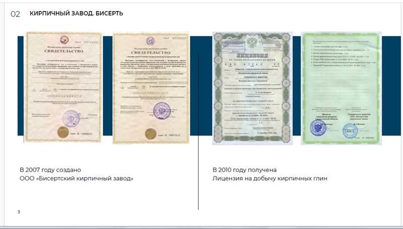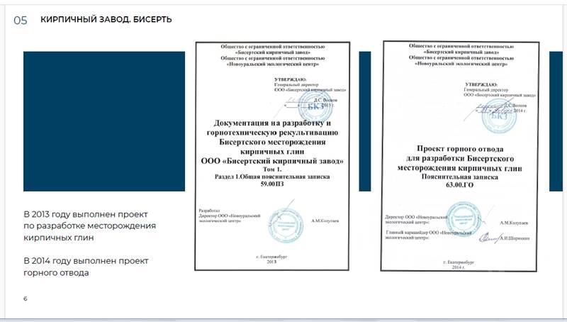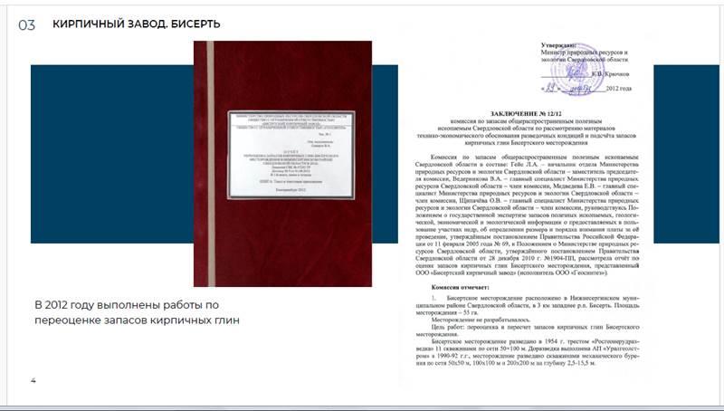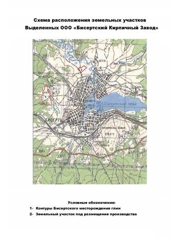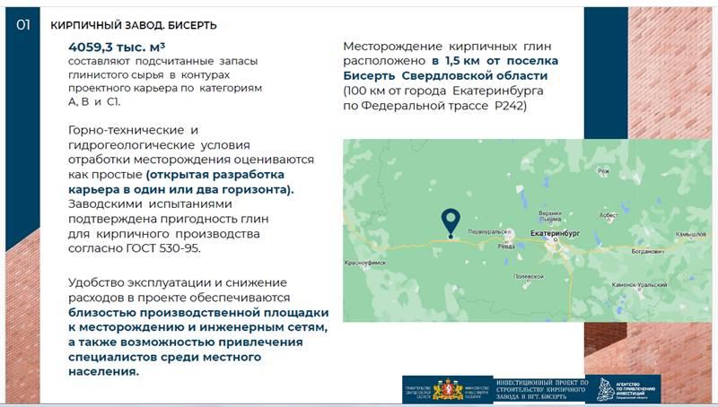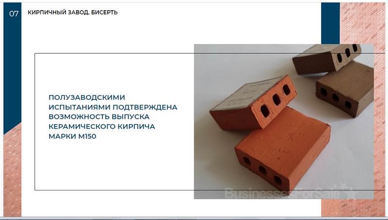 В пгт. Бисерть (100 км. от города Екатеринбурга по Федеральной трассе Р242). - Лицензия на право пользования недрами (для геологического изучения, разведки и добычи кирпичных глин Бисертского месторождения). Подсчитанные запасы глинистого сырья в контурах проектного карьера составляют 4059,3 тыс.м3. по категориям А,В и С1. Заводскими испытаниями подтверждена пригодность глин для кирпичного производства согласно ГОСТ 530-95. - Проектная документация (Доразведка месторождения; Отчет по оценке запасов кирпичных глин; Отчет об испытаниях и анализах сырья; Проект горного отвода для разработки месторождения; Документация на разработку и горнотехническую рекультивацию месторождения и т.д.). - Возможность аренды земельного участка площадью 8,7 га., для строительства завода по производству строительной и декоративной керамики. Готовы предоставить дополнительную информацию и рассмотреть варианты сотрудничества.