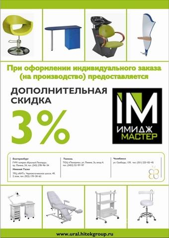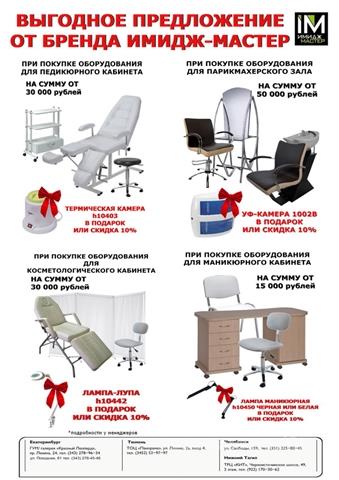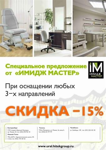 Предлагаем выгодные скидки по комплектации кабинетов и полное оснащение салонов красоты, парикмахерских, косметологических, маникюрных и педикюрных кабинетов оборудованием от Имидж Мастер.