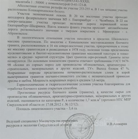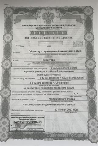 Продается ООО, владеющее лицензией на гранитный карьер, расположенный в 40 км западне Каменск-Уральского, в 5 км юго- западнее п. Сосновский. Лицензия до 2037 года. Гранит отвечает требованиям ГОСТ 9479-98 "Блоки из горных пород для производства облицовочных, архитектурно-строительных, мемориальных и других изделий". Цвет гранитов серо-розовый. Вскрышные породы - почвенно- растительный слой и кора выветривания гранитов песчано-глинистого состава с незначительной примесью дресвы и щебня. Вдоль южного фланга проходит автодорога с твердым покрытием с.Мраморское-с.Абрамовское. Участок экономически освоен. Цена 12 млн. руб.
