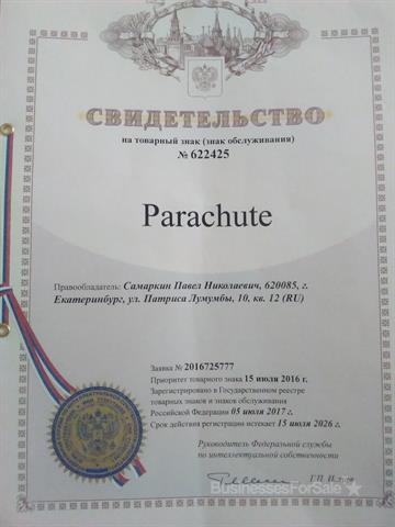 Добрый день! Продаю товарный знак "Parachute". Знак зарегистрирован по четырём классам МКТУ. 18-для производства (выпуска) кошельков, зонтов, дорожных наборов, одежды для домашних животных, обивки для мебели, различных сумок, чемоданов, рюкзаков, ремней. 25-нижнее белье, обувь (практически все виды), галстуки, вся верхняя одежда, церковная одежда, свитера, рубашки, куртки. 35-услуги рекламных агенств, подбор персонала, аудит, прокат, помощь в управлении бизнесом, информационные услуги, маркетинг, спортивный менеджмент, аукционная продажа. 37-бурение скважин, ремонт автотранспорта, ремонт одежды, строительство моллов, дорог, автомоечные услуги, прокат автомобилей, клининг. Рассмотрю вариант аренды или вклада в ваш бизнес. Стоимость 90000 (девяносто тысяч) рублей. Товарный знак: «Parachute» Год основания: 2016 Страна: Россия Категории: Одежда, обувь, услуги Обозначение : Р66 Цвета: светло-зеленый и голубой Слоган: «Могу. Помогу» «I can help you» Сайт : есть Философия торгового знака: Помощь, поддержка, изменение жизни человека в лучшую сторону.