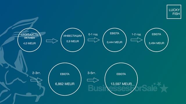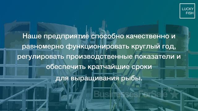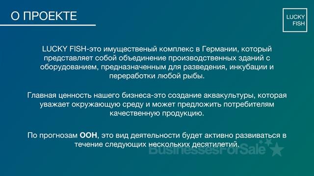 LUCKY FISH-это имущественый комплекс в Германии, который представляет собой объединение производственных зданий с оборудованием, предназначенным для разведения, инкубации и переработки любой рыбы. Общая площадь территории составляет 26 572 м2 (на 2 участках). В его состав входят:• Здание переработки, площадью 632,21 м2 (для изготовления икры, полуфабрикатов и готовых продуктов из мяса рыбы);• основное здание 1, площадью 2 366 м2(включая: лаборатории, офисные помещения, душевые)• основное здание 2, площадью 5 710 м2 (включая: лаборатории, офисные помещения, душевые)• кормосклад/гараж, площадью 124 м2• внешние вспомогательные производственные сооружения Стоимость объекта 4 003 MEUR