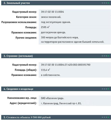 Земельный участок в курортном поселке Отрадное. Доступность до моря 300 м. Зеленая зона. На территории находится здание бывшей котельной (в собственности) Оформлен объект на юридическое лицо: Кадастровый номер участка: 39:17:020011:0004 Категория: земли поселений Разрешенное использование: под эксплуатацию здания Правовое основание: долгосрочная аренда Котельная: Кадастровый номер: 39:17:020011:0004:27:420:002:000 1 91790 Площадь: 115,4 м2 Правовое основание: в собственности