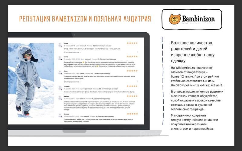 Мы продаем Торговую Марку, под которой производили и продавали уникальные детские комбинезоны «Bambinizon» с 2012 года. Максимальная годовая выручка – 101 млн. руб. Все комбинезоны (демисезонные и зимние) защищены патентами. Они обеспечивают уникальность предложения. С 2017 года было продано более 500 тыс. комбинезонов Bambinizon Преимущества - Уникальные, полностью прикладные изобретения – патенты в РФ (также в США, Китае, Японии, Германии) - Зарегистрированная торговая марка Bambinizon в 17 странах). - Высокая известность бренда и доверие покупателей (высокий рейтинг на маркетплейсах – 4,8/5, отличные отзывы). - Комбинезоны – максимально удобны и практичны: застежка на попе, ветрозащита, эластичные манжеты, возможность свободно двигаться. - Модельная база 200 артикулов комбинезонов и другой одежды, сезонные линейки, любой дизайн, фэшн. - Есть взрослая линейка с собственной торговой маркой.