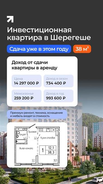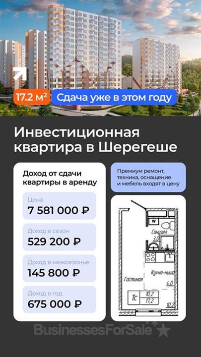 Шерегеш — посёлок городского типа в Таштагольском районе Кемеровской области — Кузбасса у подножия горы Зелёная. Известен своим горнолыжным курортом, самая длинная трасса которого составляет 3 900 метров. Курорт является одним из самых популярных, третьим по посещаемости в России (2,5 млн. туристов в год, в том китайские и туристы из других стран). До 2032 года планируется строительство международного аэропорта рядом с посёлком (в 18 километров от жилого комплекса) и продление. железнодорожной ветки. В развитие курорта уже вложено более 150 млрд. рублей. В пешей доступности находятся образовательные учреждения, медицинские центры, магазины и супермаркеты. До центра 15 минут пешком. Застройщик - крупнейшая компания в Кемеровсой области. Срок сдачи дома - третий квартал 2026 года. Предлагаются квартира-студия, площадью 17,2 кв.м. и однокомнатная квартира, площадью 38 кв.м. Ремонт премиум-класса, натяжные потолки, встроенная бытовая техника и мебель входят в стоимость. Этажность дома, в зависимости от корпуса, составляет 10-14 этажей. Высота потолков: 2,79-3 метра. Жилой комплекс состоит из 19 корпусов. Возведены по монолитной технологии строительства с фасадами, облицованными штукатуркой. На первых этажах расположены ресепшн, лаунж-зона, кофе-бар. Установлены пассажирский и грузовой лифты. Территорий комплекса имеет реализована в концепции «двор без машин». Во дворах обустроены зоны отдыха, детские площадки, пространства для занятий спортом на открытом воздухе, прогулочные маршруты по зеленым скверам, благоустроенным парковым дорожкам. Для владельцев автомобилей предусмотрены стоянки и подземные паркинги. При суточной аренде ставка около 7 000 рублей. Своя управляющая компания, работающая с владельцем по агентскому договору (60/40 %) и решающая все вопросы, включая поиск арендаторов. Налог и коммунальные услуги оплачиваются собственником. Студия: стоимость - 7 581 000 рублей, доход за сезон - 529 200 рублей, доход в межсезонье - 145 800 рублей, доход за год - 675 000 рублей. Однокомнатная квартира: стоимость - 14 297 000 рублей, доход за сезон - 734 400 рублей, доход в межсезонье - 259 200 рублей, доход за год - 993 600 рублей. Имеются готовые квартиры в сданных корпусах для сдачи в аренду или собственного проживания. Рядом с домом расположен подъемник с доступом к горнолыжным трассам горы Зелёная - это делает квартиры удобными для туристов и напрямую влияет на их востребованность и доходность. Уточняйте подробности приобретния и расчёт доходности. Ипотека от 6 % годовых, использование материнского капитала. рассрочка, с первоначальным взносом - 50 %. Возможна онлайн-покупка.
