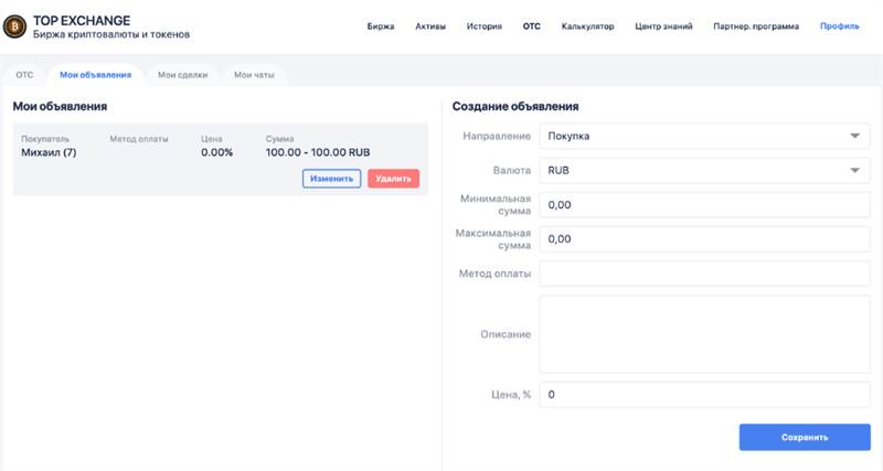 Продается платформа для торговли криптовалютой и токенами с возможностью кастомизации под ваши задачи. По наполнению биржа более всего похожа на garantex.org с дополнительным функционалом. На бирже реализовано пополнение кодом для нескольких популярных для обмена валют включая рубли. При необходимости возможно добавить те валюты и токены, которые подходят под ваши задачи. Удобное пополнение и снятие через код в разделе OTC с заморозкой активов пользователя на сумму сделки для борьбы с мошенничеством. Также возможно реализовать прямой обмен любого кода на любой минуя USDT. (Например RUB-KZT / KZT-RUB) На базе этой платформы вы можете запустить покупку-продажу токена вашего криптопректа. Раздел активы В данном разделе пользователь может просмотреть балансы кошельков, пополнить и вывести активы с помощью кода. В активах подключены кошельки USDT TRC20, BTC, Рубли, Тенге, Сомы, Дирхамы. Также выводится информация о партнерской программе. Раздел ОТС Позволяет пополнить баланс биржи или вывести баланс удобным способом. В разделе ОТС пользователи создают объявления на покупку/продажу кода и предпочитаемый способ расчета. Раздел биржа Представлен стаканом ордеров пользователей на покупку/продажу активов по текущей стоимости. Торговые пары настраиваются под ваши задачи как для покупки-продажи USDT и BTC за код так и для кроссобмена кода разных валют напрямую. Стаканы поддерживают типы ордеров с ценой по рынку и фиксированной ценой. Возможно автоматическое следование за биржевыми курсами с гэпом в %% Раздел реферальная программа В этом разделе формируется реферальная ссылка и отслеживается статистика по реферальной сети и поступлениям с нее. Раздел профиль В этом разделе происходит настройка профиля пользователя и аутентификации 2FA
