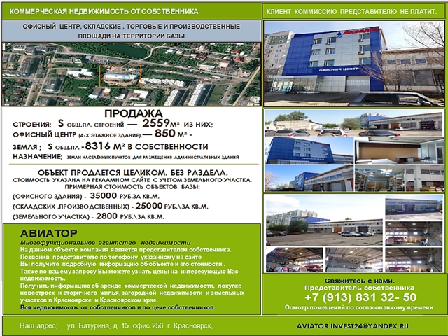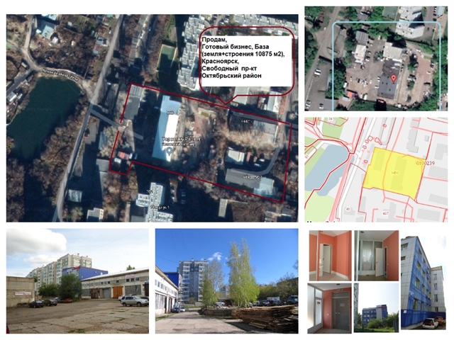 Продам, Готовый бизнес, Свободный, земля+строения 10875 кв.м, Красноярск, Октябрьский. Земельный участок общей площадью -8316 м2 и расположенный на участке производственно-складской комплекс с офисным зданием состоящий из 4-х (четырёх) объектов недвижимости имеющих право собственности по выписке из ЕГРН и 5-х (пяти) объектов движимого имущества включая КПП и складские помещения оборудование электроподстанции и контейнера 20 футовые по договорам купли – продажи движимого имущества. Общая площадь объектов составляет 2559 м², в том числе 850 м² - офисная.(4-х этажное здание). Все помещения сданы в аренду на срок не более 11 месяцев. Производственно-складской комплекс с офисным зданием и земельный участок находится в Октябрьском районе г. Красноярска. Окружение – преимущественно жилая зона. В ближайшем окружении территории находится ПАО МРСК Сибири БСМП, ГПТУ, на расстоянии 1 км. СФУ, в близи расположено озеро и лесная зона. До объекта дорога асфальтированная. Земельный участок огорожен забором по периметру, есть общий вход через КПП. На территории расположено офисное, производственное, складское здание, контейнерный парк, стоянка для транспортных средств. Допускается въезд через ворота для грузового транспорта. Внутренний двор имеет асфальтированный подъездной путь к производственно - складскому комплексу, остальная территория благоустроена газонами. По периметру участка установлено видеонаблюдение. Также на территории расположена трансформаторная подстанция. Обременения по земельному участку не зарегистрированы. Коммуникации; Тепловая сеть - собственная котельная (имеется возможность подключения к городской сети) Электроподстанция (РУ -10кВа) оформлена в собственность. Холодное водоснабжение стоки – городские сети Объект находится под круглосуточной охраной. Преимущества объекта – Расположение в черте города. - Земельные участки в собственности. - въезд через ворота для грузового и легкового транспорта (первая линия); – проезд для еврофур; – асфальтированный подъездной путь к производственно-складскому комплексу с городской дороги во внутренний двор; – Охраняемая территория. - полная автономность по теплу (электроэнергии); - собственная электроподстанция. – наличие свободной земли; – есть общий вход через офисное здание; – по периметру видеонаблюдение и забор; – территория благоустроена газонами и деревьями; - Имеются площадки с контейнерами 20 фут. – обременений по земельному участку и объектам нет; – возможность продать (Территорию ) под городскую застройку : Имеется: парковка. Дом кирпичный, дизайнерский ремонт. Продажу осуществляет представитель собственника. Ризамамедов Андрей Владимирович Цена предложения 107 млн. руб. Торг.