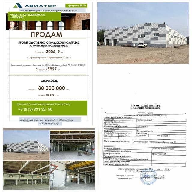 Продам:Помещение под производство и склад 3007 кв.м, высота потолков: 5.8 м, подключенная мощность: 80 кВт... цена: 80 000 000 руб. за объект. 26 605 руб. за м2 Объект: Расположен на арендованном земельном участке площадью -5927м2. кадастровый № 24:50:0700249:66. по адресу: г. Красноярск ул. Парашютная 90 Специализация; Производственное\административно - складское здание • Год завершения строительства - 1977 г. • Окончание капитального ремонта – 2018 г. • Высота здания – 6,10м, длина - 71,90м, ширина - 35,55м. Высота потолков - 5,80м 1 этаж (S общ. пл-2459,7 м²) Производственные/Административно- складские помещения В том числе; Sпл -106,7 м² - котельная. Sпл -70 м² - раздевалки, тех помещения, санузлы, Sпл - 456,5 м² - свободные площади (для развития производства); подсобные помещения (для персонала). Объект расположен на надёжном свайном фундаменте: Полы бетонные, с антипылевым покрытием, капитальный ремонт полов завершён в апреле 2018г. Нагрузка на пол 15 т. /м². • Погрузо-разгрузочные возможности. Имеется 2 кран-балки грузоподъёмностью - 3,5 и 2,5т • Естественное освещение; окна \ витражи в складских/производственных помещениях. • В здании 4 отдельных входа, 3 из которых ворота 4,5х4,5м. Тип ворот (Dorhan) механические предназначены для въезда и выезда крупногабаритного грузового авто транспорта. Установку завершат до 01 июня 2018г. 2 этаж • В основном здании на втором этаже удобно расположены офисные помещения (S пл - 547,2 м²) Имеются отдельные кабинеты для руководителя, заместителя, инженерного состава и рабочего персонала Входная группа; Основной вход на второй этаж - с территории а также с производственного помещения. Транспорт. До объекта курсирует маршрутный автобус № 6 по маршруту (Северный- Предмостная площадь – Парашютная) № 58, № 92 (Семафорная - Парашютная). • На прилегающей территории имеется парковка для грузовых авто (10 машиномест) открытая не охраняемая. • Парковка для персонала и клиентов на 20 машиномест, открытая не охраняемая. • На территории имеется кофе, столовая. Коммуникации: - холодная вода (городские сети); - канализация (городские сети); - отопление (городские сети), дополнительно оборудовано в отдельном помещении автономное отопление (котёл на твёрдом и жидком топливе); - электричество (городские сети по договору на электроснабжения с ПАО «Красноярскэнергосбыт»). Мах. мощность - 80кВт. Категория надёжности –Ш. Есть возможность для увеличения мощности; - приточно – вытяжная принудительная вентиляция; • Имеется система гидрантов для подключения водяной системы пожаротушения. • охранно-пожарная сигнализация, телефон, интернет, видеонаблюдение, отсутствует. • Место расположения объекта идеально подходит для производства и складского хранения. • Транспортная логистика позволяет в короткие сроки без простоя на пробки доставить грузы из любого района Красноярского края, для сбыта и хранения продукции. Возможен, как наличный, так и безналичный расчет.