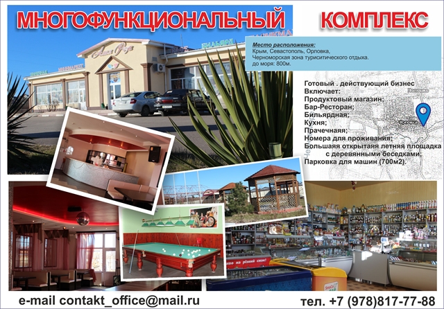 Многофункциональный комплекс. Включает в себя магазин, бар-ресторан, бильярдная, летняя площадка с деревянными беседками, мангал, прачечная, 800м до моря ДОХОД ПРИ СДАЧЕ В АРЕНДУ 6000000Р Доход при собственной эксплуотации 12000000р оборот, в год 45000000р