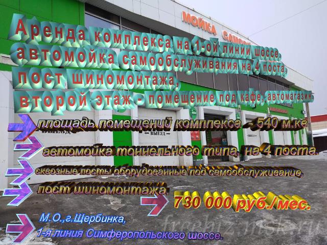 Аренда Действующего Авто Моечного Комплекса Самообслуживания Со Вторым Этажом На Первой Линии Симферопольского Шоссе. Отдельно стоящее, двухэтажное здание, расположено непосредственно на дублёре Симферопольского шоссе, по соседству с объектами торговли, сервиса, общественного питания. Месторасположение – город Щербинка. Первый этаж – 4 поста автомойки самообслуживания закрытого типа и пост шиномонтажа. Тип постов – сквозные, с двумя воротами (въезд/выезд) на каждом из постов. Своя прилегающая территория, обеспечивающая как свободный въезд, так и удобный, свободный выезд с автомойки, и удобную, просторную площадку для ожидания. Так как автомойка закрытого типа (Оборудована автоматическими воротами и системой отопления постов) – имеется отличная возможность круглогодичной работы в независимости от превратностей погоды, а также возможно расширение перечня оказываемых услуг за счёт ручной мойки, химчистки, детэйлинга. Автомойка и шиномонтаж полностью оборудованы, функциональны, рейтинг комплекса на Яндекс 5 *. Второй этаж комплекса имеет отдельный вход и идеально подошёл бы под размещение общепита, кафе, ресторана и/ или автомагазина, запчастей, сезонного хранения колёс, автомасел и других объектов придорожного сервиса. Общая площадь комплекса – 540 м.кв. Центральное водоснабжение. Центральная канализация. Газ. Условия аренды комплекса: Ставка аренды за весь комплекс – 730 000 рублей в месяц. Коммунальные услуги – отдельно, по приборам учёта. Депозит – 1 месяц арендной платы. Предложение без комиссии. Отдельно автомойка и шиномонтаж - НЕ СДАЮТСЯ. Агентов и посредников – просьба не беспокоить! Более подробная информация и фотографии комплекса - в презентации по запросу.