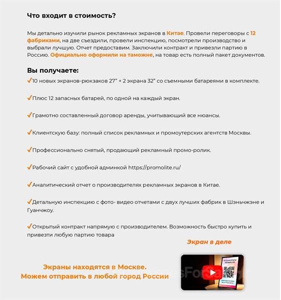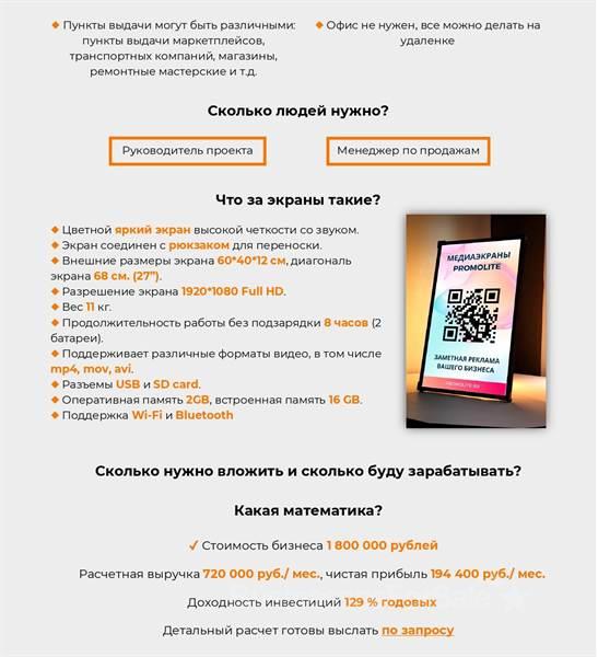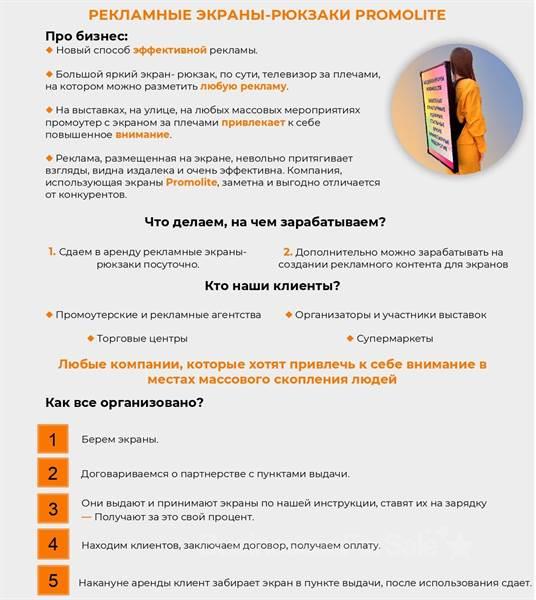 Про бизнес: Новый способ эффективной рекламы. Большой яркий экран- рюкзак, по сути телевизор за плечами, на котором можно разметить любую рекламу. На выставках, на улице, на любых массовых мероприятиях промоутер с экраном за плечами привлекает к себе повышенное внимание. Реклама, размещенная на экране, невольно притягивает взгляды, видна издалека и очень эффективна. Компания, использующая экраны Promolite, заметна и выгодно отличается от конкурентов. Что делаем, на чем зарабатываем? Сдаем в аренду рекламные экраны- рюкзаки посуточно. Дополнительно можно зарабатывать на создании рекламного контента для экранов. Что за экраны такие? Цветной яркий экран высокой четкости со звуком. Экран соединен с рюкзаком для переноски. Какая математика? Сколько нужно вложить и сколько буду зарабатывать??? Стоимость бизнеса 1.800.000 руб. Расчетная выручка 720.000 руб/мес, чистая прибыль 194.400 руб/ мес. Доходность инвестиций 129 % годовых. Детальный расчет готовы выслать по запросу.