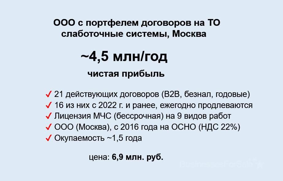 Собственник продает бизнес по слаботочным систем с портфелем контрактов на техобслуживание (ТО) в Москве. Окупаемость ~1,5 года Ключевые цифры (без НДС) • Выручка 2025: 13,5 млн.р. в т.ч. 45% – годовые договоры на ТО • Вся выручка – монтаж и обслуживанию АПС и СОУЭ, СКУД, видеонаблюдения • Чистая прибыль по ТО: ~4,5 млн.р./год • Среднемесячная выручка по ТО: 504 тыс.р./мес • Рост выручки 2025/2024: +53% • Телефон 985 919-26-84 • Выручка 1 кв. 2026: 2,8 млн.р. Основная ценность – портфель действующих годовых договоров на техническое обслуживание (ТО) Контракты и клиенты • 21 действующий договор ТО (10 клиентов) • 16 – ежемесячная оплата, 5 – ежеквартальная • 16 договоров заключены в 2022 г. и ранее, стабильно продлеваются О бизнесе • ООО (Москва), работает с 2016 года на ОСНО (НДС 22%) • Единственный собственник / гендиректор с основания • Лицензия МЧС (бессрочная, подтверждена в 2024 г.) • Нет займов; нет судебных споров; нет долгов по налогам • Клиенты B2B, расчеты – безнал, никаких откатов Команда и процессы • Ключевой инженер (ИП) работает на постоянной основе с компанией 6-й год, готов продолжить сотрудничество. • На субподряд регулярно привлекаются еще инженер (ИП) и монтажники • Бухгалтер в офисе 4 дня в неделю, договор с ее ООО, работаем второй год Операционка по ТО выстроена, не требует участия собственника Что входит в сделку • ООО с чистой историей, УК 50 т.р. • Лицензия МЧС на 9 видов работ, подтверждена в 2024 г. • Все действующие договоры • Клиентская база и контакты • Бухгалтерия (1С + отчетность) • Документы (ЭДО + бумага) • Офис, аренда по юрадресу > 5 лет, ~45 тыс./мес • Нотариальное оформление (за счет покупателя), вся сумма в договоре • Подпишу обязательство по не переманиванию клиентов Важные моменты • Есть крупный заказчик (10 договоров), работаем с 2022 г., контакты передам и познакомлю • У трети договоров нет автопродления, их надо перезаключать ежегодно Эти факторы учтены в цене Опционально (не входит в цену) Можно приобрести весь бизнес, дополнительно к ТО сюда входит отлаженная система лидогенерации: • товарный знак (зарегистрирован в Роспатенте) • трастовый сайт на Битриксе (ТИЦ 80, домену 18 лет) с доменом • коробочный Битрикс24 на отдельном домене с полным функционалом на 12 пользователей • интеграция сайта, Битрикс24 и Метрики с динамическим коллтрекингом • настроенные рекламные компании Опциональный вариант подходит для компаний, выходящих на рынок Москвы: кроме портфеля ТО им будут полезны и команда, и офис с имуществом, и возможность сразу получать поток заявок.