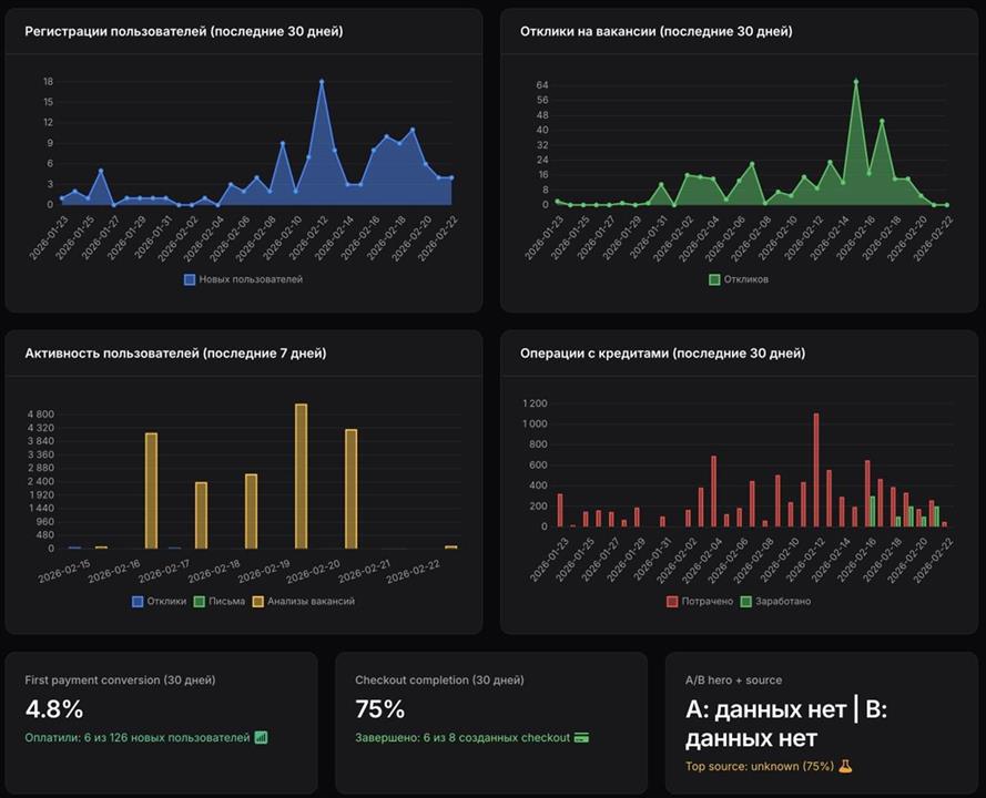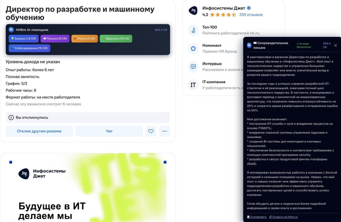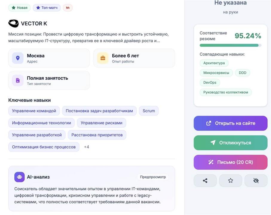 HHBro.ru — **AI-ассистент для поиска работы** с глубокой интеграцией HeadHunter (hh.ru). Сервис помогает соискателям быстрее находить подходящие вакансии и отправлять отклики с качественными сопроводительными письмами. **Целевая аудитория:** активные соискатели в России и СНГ, которые пользуются hh.ru и хотят экономить время на анализе вакансий и написании писем. ### Проблема и решение **Проблема:** Ручной разбор десятков вакансий и написание уникальных писем под каждую отнимает часы. Соискатели откликаются реже или копируют шаблоны, что снижает откликаемость. **Решение:** Один вход через аккаунт hh.ru > ИИ анализирует вакансии и показывает процент соответствия резюме > одна кнопка генерирует несколько вариантов письма (деловое, «честное ИИ», стартап и др.) > выбор стиля и отклик с копированием письма в буфер. Всё без выхода из привычного workflow. ### Ключевые возможности - **Интеграция с HeadHunter:** OAuth2, синхронизация резюме, подтягивание сохранённых поисков и вакансий. - **AI-анализ вакансий:** оценка соответствия резюме вакансии (процент и пояснения), умная фильтрация и сортировка. - **Генерация сопроводительных писем:** несколько стилей (стандарт, «честное ИИ», классика, стартап, деловое, «только цифры», «человеческое»); настройка набора стилей и стиля по умолчанию. - **Мультипоиск:** параллельный поиск по нескольким запросам/источникам, прогресс и обогащение деталей вакансий. - **Пакетные отклики:** выбор вакансий и массовая подготовка откликов с письмами (открытие hh.ru + копирование текста). - **Система кредитов (CR):** монетизация через списание CR за генерацию писем, перегенерацию, добавление стилей; пополнение баланса. - **Веб и десктоп:** SPA (Vue) + опциональное Electron-приложение для работы без браузера. - **Адаптивный интерфейс:** карточки вакансий, фильтры, режимы отображения (список/сетка), тёмная тема. ### Технологии (для технических покупателей) - **Backend:** Laravel 11, Apiato 13 (Porto SAP), PHP 8.2+, MySQL 8, Redis, Laravel Passport (OAuth2), очереди (Supervisor). - **Frontend:** Vue 3 (Composition API), Vue Router, Vite 6, Tailwind CSS, TypeScript в ключевых модулях. - **Инфраструктура:** Docker (Laradock), Nginx, PHP-FPM, очереди и воркеры. - **AI:** интеграция с провайдером (например, GigaChat/другие) для анализа и генерации текста; валидация и парсинг ответов. - **Качество:** PHPUnit, функциональные и юнит-тесты по контейнерам, OpenAPI (v1/v2), сгенерированные SDK для фронта. Проект модульный, с чётким разделением по доменам (Vacancy, CoverLetter, AI, Credit, MultiSearch и др.), что упрощает доработку и передачу команде. ### Модель монетизации - Внутренняя валюта **кредиты (CR)**. Пользователь получает стартовый пакет (например, при регистрации); далее покупает пакеты пополнения. - Списываются CR за: генерацию набора писем под вакансию, перегенерацию, добавление одного стиля или всех оставшихся со скидкой. - Большой набор функционала, покрытый платежами, полная автоматизация. - Готовность к подключению платёжной системы (модуль Payment, конфигурация стоимости операций в конфиге). ### Что входит в сделку - Исходный код (веб-приложение + десктоп, backend и frontend). - Документация: README, установка, API (OpenAPI), описание контейнеров. - Конфигурация окружения (примеры .env), Docker-сборка, миграции и сидеры. - База кода без привязки к личным ключам; покупатель подставляет свои HH OAuth, AI API и при необходимости платёжный контур. ### Зачем продавать / зачем покупать **Для продавца:** готовый продукт с доказанной технической реализацией и архитектурой; можно сфокусиро
