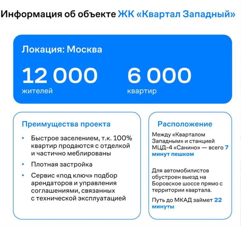 - Жилой комплекс «Квартал Западный» расположен в 7 минутах пешком до станции МЦД-4 Санино, для автомобилистов обустроен выезд на Боровское шоссе прямо с территории Квартала, путь до МКАД займет 20 минут автотранспортом.Преимущества проекта: - 12 000 жителей. - 6 000 квартир. - Быстрое заселение, т.к. 100% квартир продаются с отделкой и частично меблированы.- Вокруг частный сектор, где ритейл отсутствует.