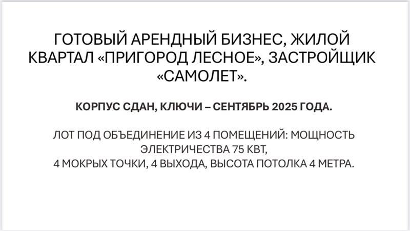 ГОТОВЫЙ АРЕНДНЫЙ БИЗНЕС, ЖИЛОЙ КВАРТАЛ «ПРИГОРОД ЛЕСНОЕ», ЗАСТРОЙЩИК «САМОЛЕТ». КОРПУС СДАН, КЛЮЧИ – СЕНТЯБРЬ 2025 ГОДА. ЛОТ ПОД ОБЪЕДИНЕНИЕ ИЗ 4 ПОМЕЩЕНИЙ: МОЩНОСТЬ ЭЛЕКТРИЧЕСТВА 75 КВТ, 4 МОКРЫХ ТОЧКИ, 4 ВЫХОДА, ВЫСОТА ПОТОЛКА 4 МЕТРА