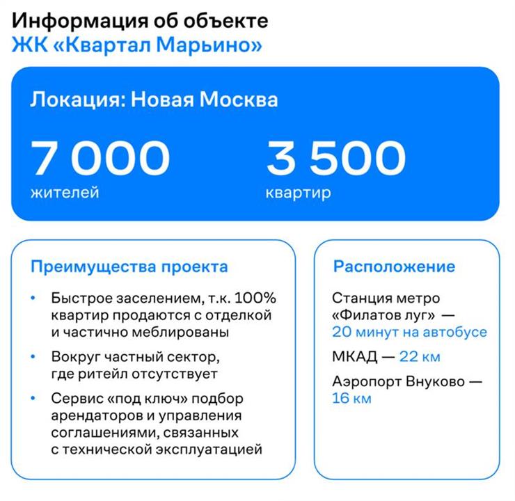 - Жилой комплекс «Квартал Марьино» расположен в 22 км от МКАД и в 16 км от Аэропорта Внуково в 20 минутах на автобусе до станции метро Филатов Луг, до центра Москвы можно добраться всего за 30-35 минут на автомобиле.Преимущества проекта: - 7 000 жителей. - 3 500 квартир. - Быстрое заселение, т.к. 100% квартир продаются с отделкой и частично меблированы.- Вокруг частный сектор, где ритейл отсутствует.