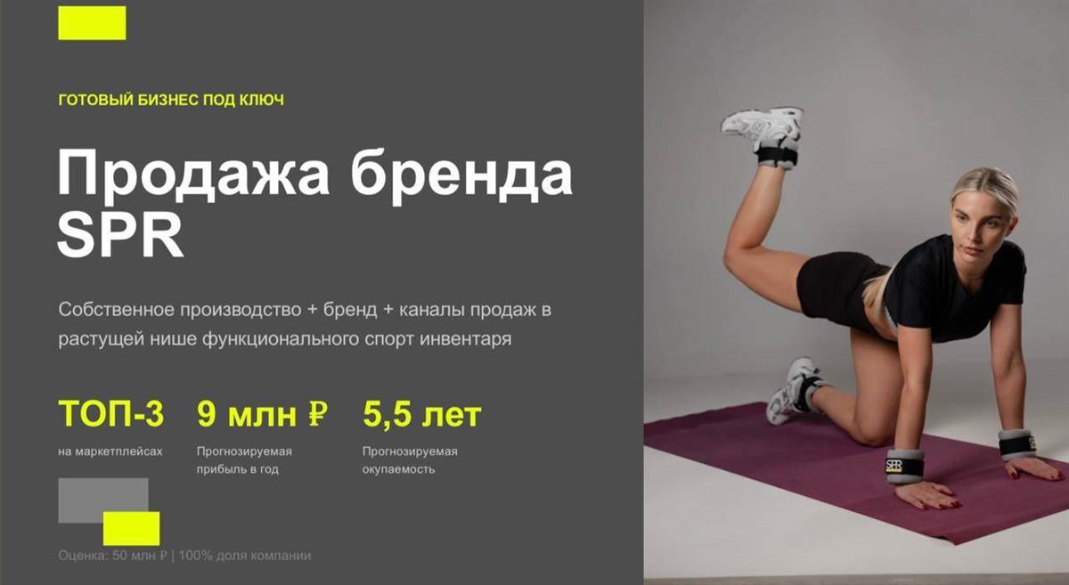 Продаётся 100% доли ООО «СПРУТС» — производитель функционального спортивного инвентаря под брендом SPR. Финансовые показатели: • Выручка 2025: 77 млн ? • Чистая прибыль: 9 млн ?/год • Рентабельность: 11,7% • Окупаемость: 5,5 лет Что входит в сделку: • Собственное производство полного цикла в Саранске • Узнаваемый бренд SPR (8 лет на рынке, рейтинг 4.8) • 50 SKU с подтверждённым спросом • Команда 24 человека (швеи, менеджеры, логистика) • Налаженные каналы продаж: Wildberries, Ozon, Яндекс.Маркет, Спортмастер, собственный интернет-магазин • Производственное оборудование, товарные остатки, контракты с поставщиками Позиция на рынке: ТОП-3 в категории «Утяжелители» на всех крупных маркетплейсах России. Не зависим от импорта — полный контроль качества и сроков. Продукция: Утяжелители (жилеты, манжеты, пояса), тренировочные системы, оборудование для кроссфита и единоборств. Условия: Цена: 50 000 000 ? P/S: 0,65x | P/E: 5,5x Основатели готовы к передаче дел и сопровождению сделки в течение 6 месяцев. Предоставим полную документацию для due diligence. Рассмотрим предложения от производителей, продавцов на маркетплейсах и стратегических инвесторов.