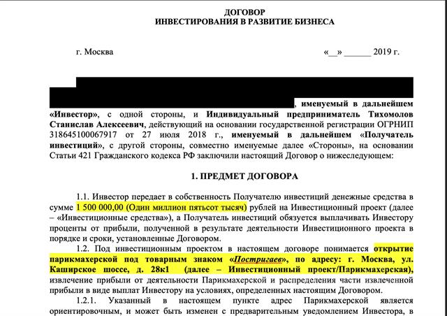 Получайте ежемесячный пассивный доход до 200 тыс. руб./в месяц, инвестируя всего от 450 тыс. руб. в сеть салонов-парикмахерских «Постригаев» в Москве. В ЧЕМ СУТЬ БИЗНЕСА? Оказание парикмахерских и нейл услуг, с отличным клиентским сервисом, профессиональными мастерами, для тех, кто ценит качество и сервис по доступной цене. ПРИБЫЛЬ ИНВЕСТОРА ПО ДОЛЯМ В МЕСЯЦ - ИЗ РАСЧЕТА СР. ЧИСТОЙ ПРИБЫЛИ В 250 000 РУБ./МЕС.: ✅ Вложите 450 000 руб., получайте пассивно = 25 000 руб./мес. (доля 10%) ✅ Вложите 900 000 руб., получайте пассивно = 50 000 руб./мес. (доля 20%) ✅ Вложите 1 350 000 руб., получайте пассивно = 75 000 руб./мес. (доля 30%) ✅ Вложите 1 800 000 руб., получайте пассивно = 100 000 руб./мес. (доля 40%) ✅ Вложите 2 250 000 руб., получайте пассивно = 125 000 руб./мес. (доля 50%) * Рентабельность капитала от 60% до 300% в зависимости от суммы и сроков вложения. ** Более 5 млн. рублей - обсуждаем индивидуально. ✅ СРЕДНЯЯ ОКУПАЕМОСТЬ ИНВЕСТИЦИЙ - 16-20 МЕС. ⁉️ ОТВЕТЫ НА ЧАСТЫЕ ВОПРОСЫ: - Зачем? Какая цель? 1. Открываем собственные точки с нуля. 2. Выкупаем готовые парикмахерские, делаем ребрендинг и выводим на высокую чистую прибыль. 3. Наша цель на 2020 год - 10 собственных парикмахерских в г. Москва, и 10 фрачайзи-партнёра. ⁉️ - Что требуется от инвестора? (спойлер-ничего): 1. Инвестору не нужно участвовать в опер. деятельности. 2. Инвестор имеет доступ ко всей отчетности компании. 3. Инвестор имеет доступ к камерам, размещаемым в салонах-парикмахерских. - Мы на рынке парикмахерских "у дома" более 2-х лет. Под брендом "Постригаев" - 6 месяцев. - 6 успешно действующих салонов-парикмахерских, 1-а в процессе строительства. - Мы успешно и положительно работаем с инвесторами, и займодавцами с 2018 г., в наличии рекомендательные письма от инвесторов. - Мы готовы на любые ваши проверки, и предоставить все документы - при подтверждении, что у вас есть свободные средства для комфортного инвестирования. - Я собственник ИНН 861711219384, на меня оформляется договор инвестирования или займа (возможно поручительство юр. лица, в котором более 1 учредителя). - Да, в банке дешевле, но этот ресурс уже использован. - Рассматриваем долевое участие и займ. - Скидка на все услуги парикмахерской для вас на весь период участия в доли или займа - 20%). ⁉️ КАК ЗАРАБАТЫВАЕТ парикмахерская «Постригаев»? 1. Стрижки, наращивание, окрашивание 2. Коррекция бровей, ресницы 3. Ногтевой сервис У вас есть возможность инвестировать в одну из открытых студий в Москве и получать прибыль с первого месяца. ПИШИТЕ, Пришлем презентацию, договор и ответим на все вопросы! Звоните! P.S. На фото наши инвестора)