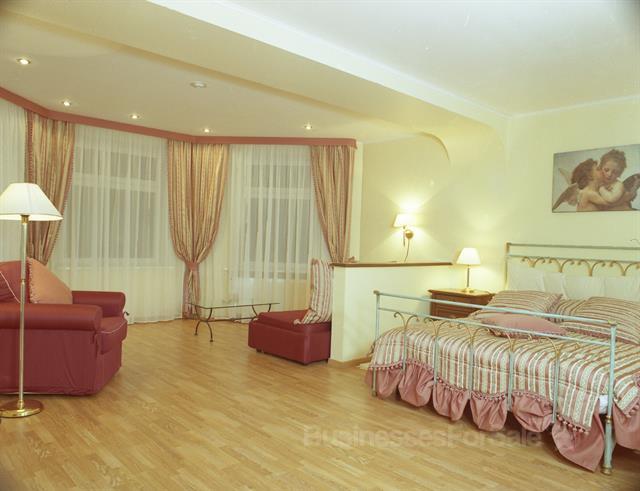 корпус «гостиница» на 26 номеров: категорий «стандарт» (12 номеров,) , «полулюкс» (12 номеров), «люкс» (2 номера) ; -«корпус «апартаменты» на 6 номеров: категории «люкс двухкомнатный» (4 номера), категории «апартаменты» (2 номера, площадь номера 150 кв.м); -корпус «ресторан» с 2 залами, кухней, подсобными помещениями, 7 номерами; -спортивно-оздоровительный комплекс с бассейном 10х12, 4 саунами, 2 комнатами для оздоровительных процедур, 2 комнатами отдыха, тренажерным залом, конференц- залом, бильярдной комнатой; -комплекс со стилизованным в русском стиле банкетным залом и отдельно стоящей русской баней с парилкой и комнатой отдыха; -хозяйственно-гаражное здание -домик охраны при въезде на территорию. Местоположение: Московская область, 25 км от МКАД, лесная зона (смешанный лиственно-хвойный лес).