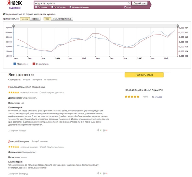 Вид бизнеса: Интернет-магазин Продается прибыльный интернет-магазин лодок ПВХ и туристических палаток. lodka-mag.ru Магазин в сумме проработал около 3-х мес. В пакет для продажи входит: -Продающий сайт с удобной админкой и настоящими аудио отзывами. Заказ осуществляется с любой страницы сайта в 3 клика и 2 поля для заполнения. Возможна оплата банк. картой и другими способами. Конверсия сайта (из директа) из посетителя в заказ 2-5% -самое полное среди конкурентов описание товаров и видеообзоры. -2 домена -Настроенная рекламным агентством кампания в Яндекс.Директ и GA на Москву и регионы (показы в гарантии и спец размещении). -Яндекс маркет с отзывами, рейтинг 4 звезды -Прямой мобильный, московский номер, -Crm система (amocrm) с информацией по всем заказам, в т.ч. указанием источника трафика. -Контакты и наработки по взаимодействию с поставщиками -Подробная и понятная процедура работы для менеджера, с 8ми утра до получения денег от курьера. операционную работу можно делегировать с первого дня на 100% -Первичное консультирование по бизнесу и рекомендации по развитию. -Бонус: Платные программы обучения по лидогенерации от известного маркетингового агенства Бизнес не требует вложений. Только деньги на рекламу. Схема расчётов с поставщиком: утром на складе купил товар, за нал или переводом на карту сбер, вечером получил от курьеров деньги с прибылью. Причина продажи: смена бизнеса, в который срочно нужны вложения. Есть вопросы? Звоните!