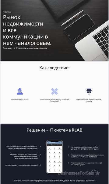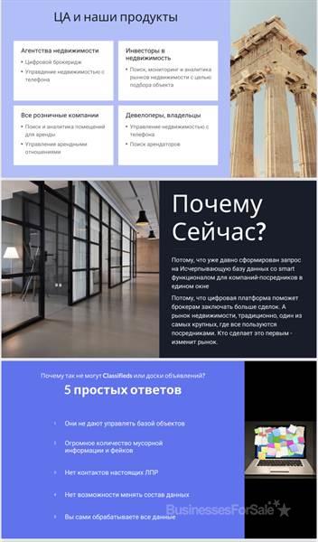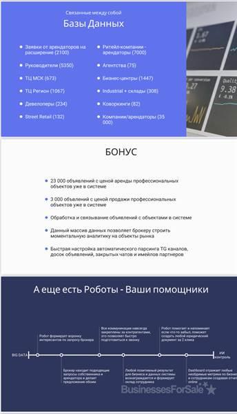 Предлагаем к продаже компанию цифрового консалтинга недвижимости по всей России (агенство коммерческой недвижимости) , которая использует big data science, чтобы сотрудники максимально быстро делали сделки с высокой комиссией. /////////////////////////////// Почему коммерческой недвижимости а не жилой? - в коммерческих сделках комиссия существенно выше, а конкуренция ниже. /////////////////////////////// Для того чтобы эффективно делать сделки в коммерческих объектах требуется исключительное знание рынка профессиональных контактов и компаний арендаторов - мы как раз решаем эту проблему. Сотрудники нашей компании лишены рутины, цифровое решение само говорит что делать команде, собственнику надо только следить за результатом и вовремя мотивировать ребят. Данное решение может быть масштабировано на любом другом рынке (другой стране) вами самостоятельно через 2 месяца после начала работы. Чтобы агенства недвижимости делали свою работу эффективно - им нужны данные. На данных мы и строим свою эффективность. /////////////////////////////// При создании бизнеса мы сделали упор на big data (цифровые процессы сбора и обработки данных), чтобы консультант (риелтор или брокер) смог увидеть весь рынок объектов и интересантов на эти объекты в нужных ему разрезах : - 7000 федеральных сетевых магазинов (брендов) с фото, требования по новым открытиям и контактами ответственных лиц - 5000 профессиональных объектов недвижимости со всей необходимой для заключения сделок информацией - 5500 ответственных за развитие ЛПР контактов, которые оставили заявки - 2000 лидов от участников профессионального рынка недвижимости на покупку / продажу / Аренду (это не авито и не циан, данные собираются ежедневно колл центром) - Запись Звонков и отправка/примем и учет имейлов в едином пространстве - Оцифрованный процесс ведения сделок под наблюдением исполнения нужных этапов ЦИ - Умные Голосовые роботы с использованием искусственного интеллекта для market research, поиска новых контактов руководителей и даже формирования новых лидов - Гибкая система по автоматизации любых задач без программирования за счёт no code решений - Собственный call center, которые как и роботы изучают рынок, узнаю информацию и обновляют данные в системе - Штат профессиональных консультантов которые закрывают сделки коммерческой недвижимости с использованием системы - Крупнейшие владельцы недвижимости наши клиенты - Tps, аэропорт Шереметьево, тц март, тц Заря, street retail R4S , РЖД, и объекты CBRE , - портфолио знаковых сделок с топ брендами- арендаторами - new balance , timberland , under Armour , 12storeez, gold Apple, selfmade, mts , Билайн , Мегафон , re store, lego, Samsung, Xiaomi и др - Мы верим что инструменты комфорта и избавления от рутины команд и спасут бизнесы в будущем /////////////////////////////// ФОТ : • оператор только за действия в системе (алгоритм сам считает з/п в зависимости от целевых действий) • брокер % от сделок • ген дир % от сделок /////////////////////////////// После покупки вы сможете сразу сделать сделки в ТЦ, street retail, это будет полезно как для новичков рынка , так и крупным профессионалам, которые хотят зарабатывать ещё больше. /////////////////////////////// Если коротко , то цифровая система изучает рынок ежедневно, а риелторы - брокеры соединяют размещённые в системе лиды друг с другом, от этого появляется сделка без холодных прозвонов агентами, а всю работу и контроль - осуществляет робот Гоша, который проведёт и вовремя напомин