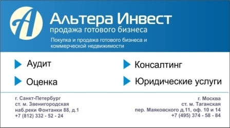 - Федеральная компания "Альтера Инвест" предлагает Вам ознакомиться с другими предложениями о продаже готового бизнеса на нашем сайте alterainvest.ru.Мы работаем без комиссии для покупателя!