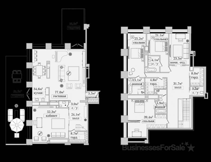 Проект представляет собой пятизвездочный апарт отель высотой в 13 этажей. В доме предусмотрены собственные дизайнерские входные группы, установлены современные скоростные лифты. Квартира без отделки расположена на 12 этаже, имеет две террасы. Общая площадь 415,8 кв.м., кухня - 111,6 кв.м. Высота потолка - 3,9 метра. Апартаменты расположены на предпоследнем и последнем этаже комплекса и поэтому обладают невероятными панорамными видами на Москву- реку, гостиницу Украина, деловой центр Москва-сити. Площади террас от 50 до 80 кв. метров. К услугам резидентов вся инфраструктура пятизвёздочного отеля – 2 ресторана и лобби-бар, консьерж-сервис, магазины, отделения банков, круглосуточный тренажерный зал, салон красоты, SPA. Для комфортного ведения бизнеса, проведения деловых встреч и приема официальных гостей предусмотрены представительская гостиная, четыре конференц-зала, переговорные комнаты, офисные помещения. В комплексе предусмотрены собственная служба эксплуатации и охраны, контроль доступа и видеонаблюдение. Паркинг располагается на 4 этажах под зданием отеля. 1 и 2 подземный этаж — это зона долгосрочной аренды. 3 подземный этаж — зона почасовой парковки, там же располагаются автомойка, детейлинг-центр, автосервис, сервис аренды автомобилей премиум-класса. 4 подземный этаж — парковка для посетителей РНЦ ВМиК. Апарт-отель находится на Арбате. В пешей доступности магазины, бутики, фитнес- центры, школы, детские сады, банки, медицинские учреждения, объекты культурного наследия. До Кремля можно дойти за 25 минут. Метро «Смоленская» находится в 10 минутах пешком. Стоимость - 831 600 000 рублей. Имеются рассрочки с первоначальным взносом от 50 %, сроком до 24 месяцев, с ежемесячными или ежеквартальными платежами. Возможны индивидуальные согласования условий приобретения. Уточняйте актуальные условия и скидки. Потенциальная доходность от сдачи в аренду - 10 % годовых.