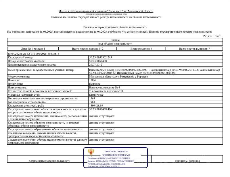 Земельный участок. Категория земель: Земли промышленности, энергетики, транспорта, связи, радиовещания, телевидения, информатики, земли для обеспечения космической деятельности, земли обороны, безопасности и земли иного специального назначения. Виды разрешенного использования: Общежития 3.2.4. Площадь: 500 +/- 39. Местоположение: 140166, Московская область, с. Боршева, Российская Федерация, Раменский городской округ. Кадастровый номер: 50:23:0050438:406. Ограничение прав и обременение объекта недвижимости: не зарегистрировано. * Здание. Наименование: Бытовое помещение № 4. Назначение: Нежилое. Площадь: 158,4. Количество этажей, в том числе подземных этажей: 2, в том числе подземных 0. Местоположение: Московская область, р-н Раменский, с Боршева. Кадастровый номер: 50:23:0050302:245. Ограничение прав и обременение объекта недвижимости: не зарегистрировано. *