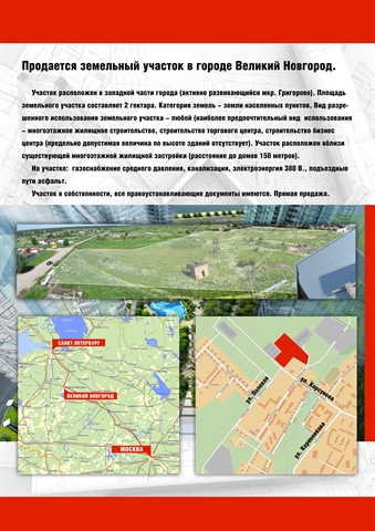 20 000 000 руб. Участок, Новгородская область, Великий Новгородпосмотреть на карте Участок, 2 га Продается участок в Новгороде, район Григорово. Участок находится в зоне формирования современного комфортного жилого микрорайона на Юго-Западе Великого Новгорода, с развитой социальной и торговой инфраструктурой. Все необходимое для удобного и комфортного проживания: школа, детский сад, поликлиника, администрация... Показать полное описание Продается участок в Новгороде, район Григорово. Участок находится в зоне формирования современного комфортного жилого микрорайона на Юго-Западе Великого Новгорода, с развитой социальной и торговой инфраструктурой. Все необходимое для удобного и комфортного проживания: школа, детский сад, поликлиника, администрация Григоровского района, универмаг «Колос». Сообщение: Рядом проходит городская магистраль с остановками общественного транспорта. До центра города 15 минут на транспорте. В пешей доступности расположен лесной массив. Земельный участок: 2 гектара, собственность. Градостроительное назначение: жилая, коммерческая, многоцелевая недвижимость. Стоимость: Участок продается за 20 000 000 рублей. Кадастровая стоимость участка в данный момент составляет 40 000 000 рублей