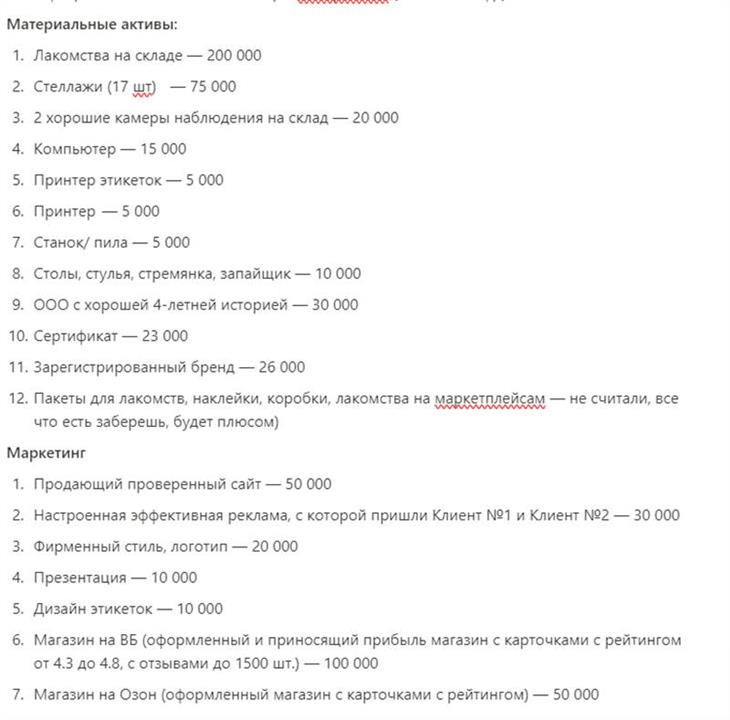 - Материальные активы:1. Лакомства на складе — 200 0002. Стеллажи (17 шт) — 75 0003. 2 хорошие камеры наблюдения на склад — 20 0004. Компьютер — 15 0005. Принтер этикеток — 5 0006. Принтер — 5 0007. Станок/ пила — 5 0008. Столы, стулья, стремянка, запайщик — 10 0009. ООО с хорошей 4-летней историей — 30 00010. Сертификат — 23 00011. Зарегистрированный бренд — 26 00012. Пакеты для лакомств, наклейки, коробки, лакомства на маркетплейсам — не считали, все что есть заберешь, будет плюсом)