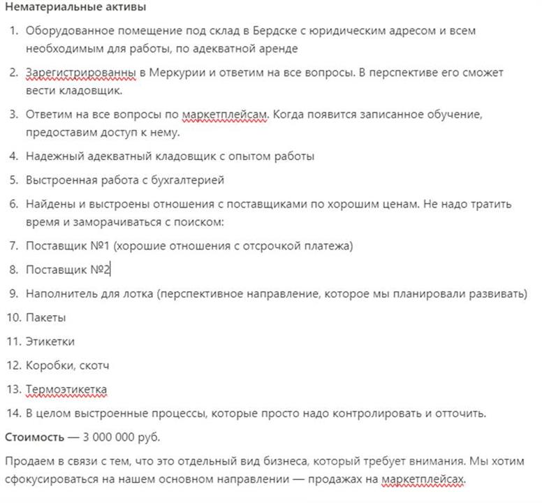 - Нематериальные активы1. Оборудованное помещение под склад в Бердске с юридическим адресом и всем необходимым для работы, по адекватной аренде2. Зарегистрированны в Меркурии и ответим на все вопросы. В перспективе его сможет вести кладовщик.3. Ответим на все вопросы по маркетплейсам. Когда появится записанное обучение, предоставим доступ к нему.4. Надежный адекватный кладовщик с опытом работы5. Выстроенная работа с бухгалтерией6. Найдены и выстроены отношения с поставщиками по хорошим ценам. Не надо тратить время и заморачиваться с поиском:?1. Поставщик №1 (хорошие отношения с отсрочкой платежа)?2. Поставщик №2?3. Наполнитель для лотка (перспективное направление, которое мы планировали развивать)?4. Пакеты?5. Этикетки?6. Коробки, скотч?7. Термоэтикетка7. В целом выстроенные процессы, которые просто надо контролировать и отточить.?