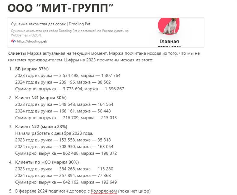 Готовый бизнес с поставщиками, магазинами на маркетплейсах и постоянными клиентами Маржа актуальная на текущий момент. Маржа посчитана исходя из того, что мы не являемся производителем. 1. ВБ (маржа 37%) 2023 год: выручка — 3 534 498, маржа — 1 307 764 2024 год: выручка — 239 196, маржа — 88 502 Суммарно: выручка — 3 773 694, маржа — 1 396 267 2. Клиент №1 (маржа 30%) 2023 год: выручка — 548 548, маржа — 164 564 2024 год: выручка — 168 161, маржа — 50 448 Суммарно: выручка — 716 709, маржа — 215 013 3. Клиент №2 (маржа 23%) Начали работать с декабря 2023 года. 2023 год: выручка — 153 558, маржа — 35 318 2024 год: выручка — 708 930, маржа — 163 054 Суммарно: выручка — 862 488, маржа — 198 372 4. Клиенты по НСО (маржа 30%) 2023 год: выручка — 384 268, маржа — 115 280 2024 год: выручка — 257 894, маржа — 77 368 Суммарно: выручка — 642 162, маржа — 192 649 5. В феврале 2024 подписан договор с Колорлоном (пока нет цифр) Маркетинг 1. Продающий проверенный сайт — 50 000 2. Настроенная эффективная реклама, с которой пришли Клиент №1 и Клиент №2 — 30 000 3. Фирменный стиль, логотип — 20 000 4. Презентация — 10 000 5. Дизайн этикеток — 10 000 6. Магазин на ВБ (оформленный и приносящий прибыль магазин с карточками с рейтингом от 4.3 до 4.8, с отзывами до 1500 шт.) — 100 000 7. Магазин на Озон (оформленный магазин с карточками с рейтингом) — 50 000 Сотрудники 1. Опытный, ответственный и проверенный кладовщик/ упаковщик, который работал замдиректора в сетевом магазине. Поиск хорошего сотрудника в среднем стоит как его месячная зарплата, считаем этот пункт — 40 000 Итого материальные активы — 724 000 руб Стоимость — 3 000 000 руб.