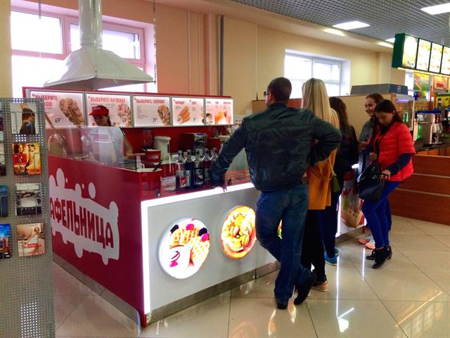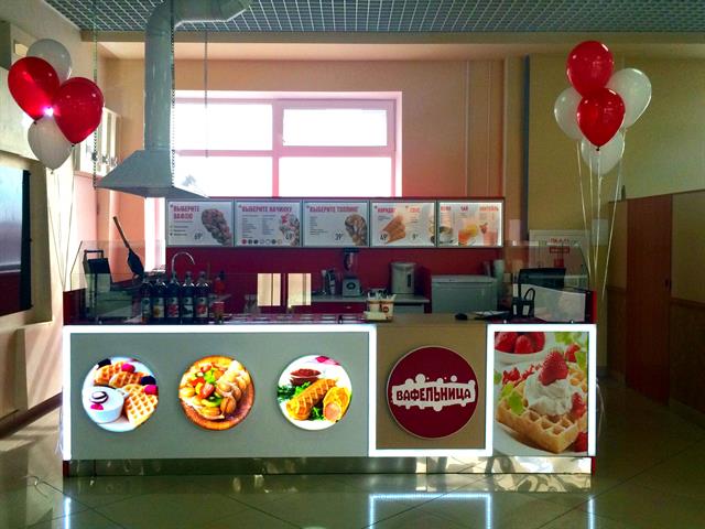 - Кафе оснащено торговым островом, 2 стола для посетителей, оборудование для приготовления вафель (3 печи), 2 холодильника, 2 блендера, компьютер, принтер чеков. Установлена программа учета и продаж. Все оборудование находится на гарантии. К торговому острову проведены все необходимые коммуникации, есть вентиляция.