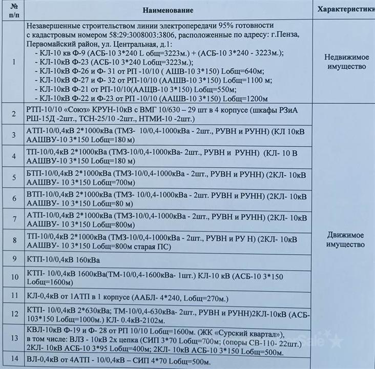 Продается недвижимое и связанное с ним движимое имущество электросетевого хозяйства, находящееся по адресу: Пензенская область, г. Пенза, ул. Центральная, 1. Электросетевой комплекс обслуживает конечных потребителей, обеспечивает постоянный доход от транзита электроэнергии. Имущество реализуется посредством аукциона на повышение цены в электронной форме, открытого по составу участников и по форме подачи предложений по цене имущества. Извещение и аукционная документация размещены на электронной торговой площадке «Сбер А» (АО «Сбербанк –АСТ). Номер процедуры: SBR028-2408230019. Ссылка - https://utp.sberbank- ast.ru/VIP/NBT/PurchaseView/43/0/0/2242627 Задаток: 77 390 руб. Начало срока подачи заявок на участие: 23.08.2024 с 17:00 Окончание срока подачи заявок: 23.09.2024 до 11:00 Дата и время рассмотрения заявок: 23.09.2024 до 17:00 Дата и время начала аукциона: 25.09.2024 в 10:00 Аукцион состоится по правилам электронной торговой площадки «Сбер А».