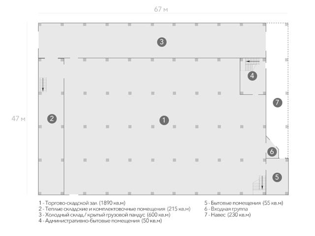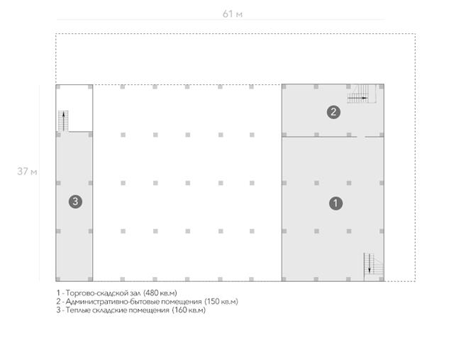 - Современный торгово-складской комплекс класса В+, введен в эксплуатацию в 2012 г. Общая площадь: более 3800 кв.м, из которых около 3200 кв.м подключены к отоплению. Этажность здания: 1 этаж (с двумя антресолями). Помимо самой торгово-складской зоны в здании также расположены административные и бытовые помещения общей площадью 270 кв.м, которые включают в себя: офисные кабинеты, серверную, комнату приема пищи, комнату