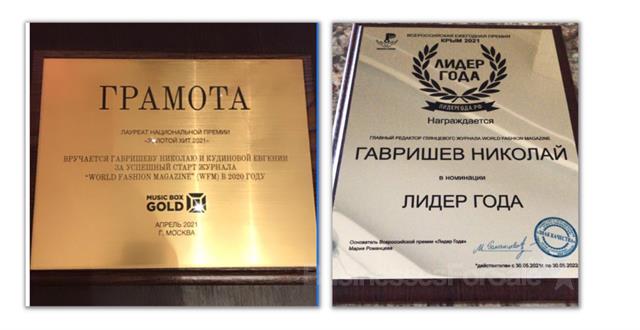- Право на проведение регионального этапа конкурсов красоты:- Top Beauty International- Miss World Fashion MagazineПраво на проведение церемонии вручения премии:- World Fashion Magazine AwardsЖурнал зарегистрирован в реестре средств массовой информации. (Регистрационный номер: ПИ №ФС77-78094).