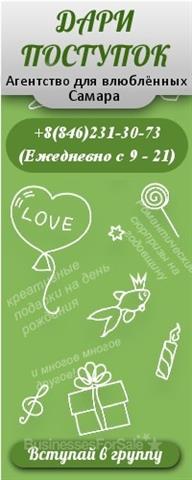 Продам право на эксклюзив бренда агентства «Дари-Поступок» в г.Самара. Дари-поступок – агентство по организации и продаже романт-х, оригин-х поступков и мероприятий (романтич. свидания, н., на крыше, предложения руки и сердца, дни рождения, свадьбы, годовщины, выписка с роддома, романт. служба доставки подарков). Агентство работает в 57 городах России. ПОКУПАТЕЛИ: девушки, парни, семейные пары Способы продажи услуг: - Розничная точка 1-2 кв.м. в ТЦ - Официальный сайт агентства - Группа в контакте - Купонные сайты Средняя цена поступка 2-4 тыс руб. Себестоимость 20-25%. Прибыль от 50 000 руб в месяц. При покупке бизнеса до конца ноября 2013г – цена 100000 руб! В цену входит: - Эксклюзив использ-я раскруч-го бренда “Дари-поступок” на г.Самара. - Сайт + Гр. В контакте - Оборуд-е для проведения свиданий, службы доставки подарков и др. - Корп. № тел. - Рекл. мат-лы - База клиентов и партнеров - Обучение по ведению бизнеса - Подключение к партнер. форуму (общение + поддержка по люб. ??) - Юр. докум.: КП, договора, инструкции Причина продажи: нехватка времени на агентство в связи с занятием др. бизнесом!