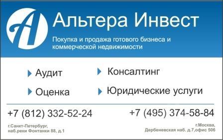 - Федеральная компания "Альтера Инвест" предлагает вам ознакомиться с другими предложениями о продаже готового бизнеса на нашем сайте: alterainvest.ruМы работаем без комиссии для покупателя!