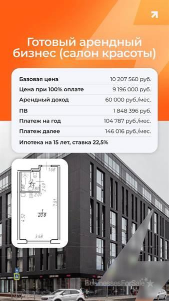 Готовый арендный бизнес в центре Санкт-Петербурга: ГАБы с уже работающими арендаторами Премиальное жилье и апарт-отели.Уже сданы в аренду под различные виды бизнеса Премиальная локация: Центр Санкт-Петербурга, улица Херсонская, близость к Невскому проспекту и метро. Доступные варианты готового бизнеса включают помещения под: • Салоны красоты • Спа- и массажные кабинеты • Тату-студии • Офисы (в том числе для типографий) • Кафе и точки питания (на первом этаже). Преимущества: • Низкий старт: доступен Первоначальный взнос от 20,1 %. • Быстрая доходность: Объект начинает приносить деньги сразу после покупки (от 55 000 до 132 000 руб. в месяц в зависимости от помещения). • Срок окупаемости в 2 раза ниже по сравнению со стандартными инвестициями в «пустую» недвижимость под аренду, благодаря уже налаженному cash flow • Управляющая компания: профессиональное управление. В прилагаемой карточке расчет доходности помещения, площадью 24,2 кв.м., занимаемого салоном красоты. Подробности уточняйте.