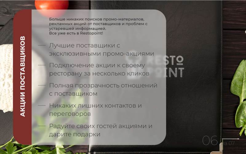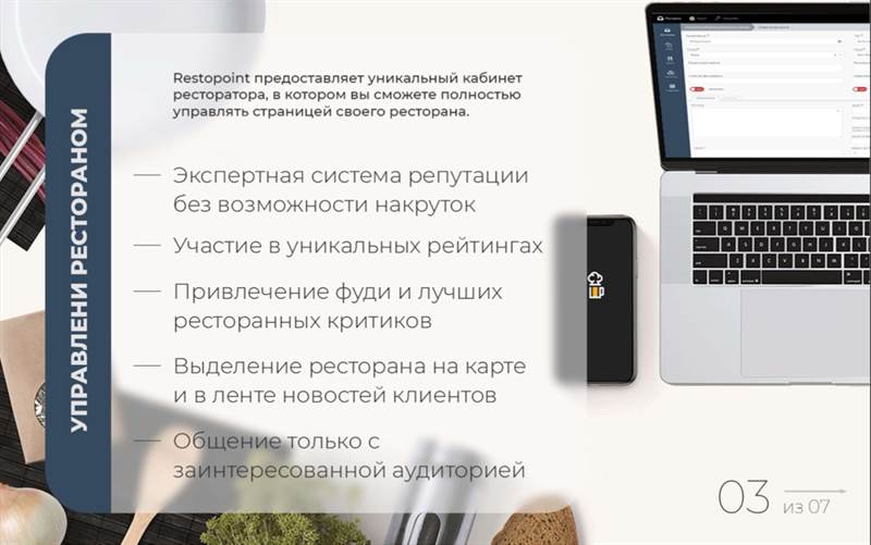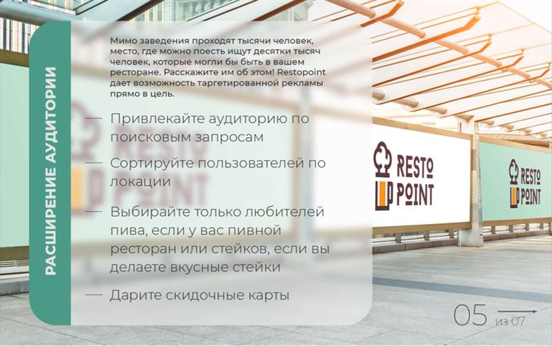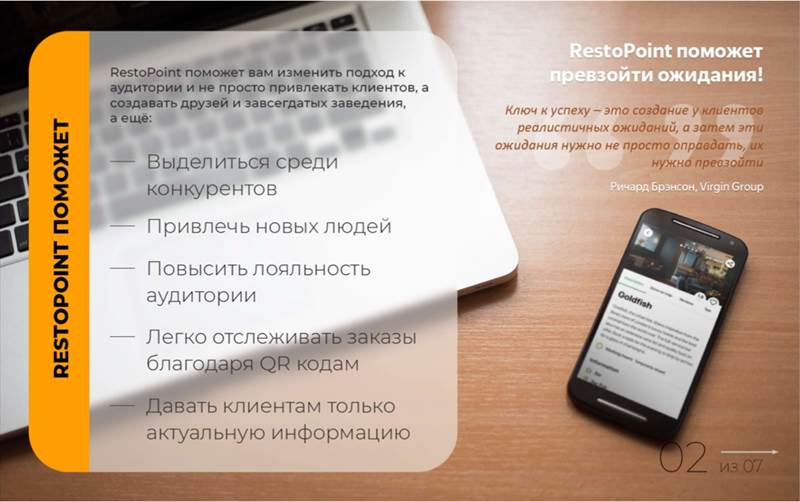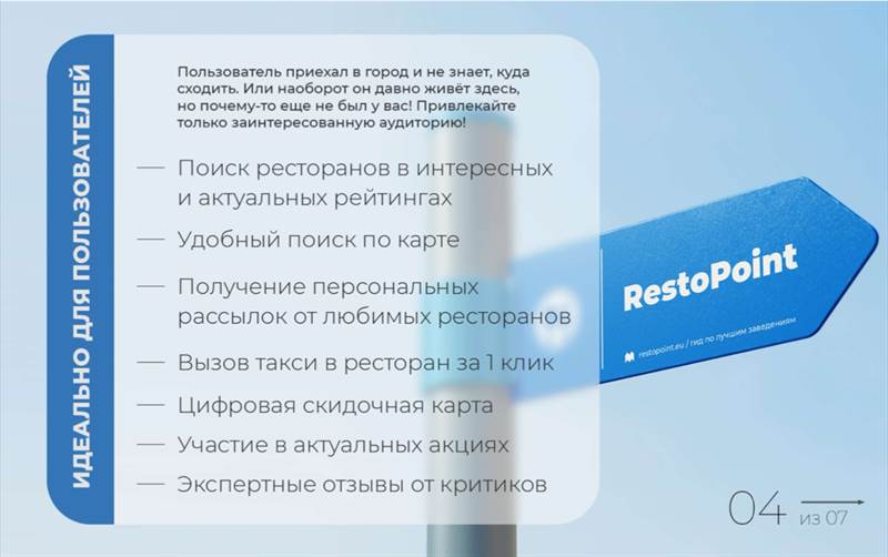 RestoPoint Что такое RestoPoint? Это приложение для ресторанного бизнеса. • Благодаря приложению будет больше клиентов • Возможность централизовано управлять акциями ресторана • Подключить единую цифровую дисконтную карту • Возможность получать акции и промо напрямую от поставщиков • Ваш ресторан может получить знак отличия и участвовать в Рекомендациях от RestoPoint - Размещать новости, рекламируя свой ресторан - Привлекать внимание пользователей к своим акциям - Взаимодействовать со своей постоянной аудиторией - Привлекать новую аудиторию RestoPoint как новая социальная сеть с начинкой для Ресторанного бизнеса. Кабинет ресторатора, кабинет поставщика и личный профиль гостя. С возможностями делать бронь, заказывать такси, формировать своё меню в каждом ресторане, делиться своим походом с друзьями и много нового в будущих обновлениях. Приложение создаётся уже более двух лет. В нем были разные этапы развития, каждый из которых испытывался как на пользователях, так и на рестораторах. Целью мониторинга было как раз и нахождение тех возможностей приложения, в которых были заинтересованы все стороны. Как только мы получали обратную связь, делали из нее соответствующие выводы, продвигались дальше. Поэтому в заинтересованности данным продуктом мы уверены, поскольку знаем потребности и желания всех сторон, подключенных к нашему мобильному приложению. Приложение развивается, подстраивается под потребности и реалии сегодняшних дней. Наша дорожная карта развития рассчитана примерно на полтора года вперёд, в том числе и этап создание системы, которая позволит довольно быстро охватывать города и страны. Возможности приложения многократно превосходят возможности других приложений и сервисов в этом направлении. RestoPoint - профессиональный продукт для сферы HoReCa и заточен под нее. Кто мы ? Мы - рестораторы которые влюблены в рестораны и желаем расширить возможности взаимодействия ресторанов со своей аудиторией. Зачем нужно приложение ? 1. Удобство использования: RestoPoint предоставляет простой и интуитивно понятный интерфейс, который позволяет быстро находить рестораны и кафе, просматривать их меню, бронировать стол и вызывать такси к выбранному заведению через интеграцию Яндекс Go. 2. Широкий выбор ресторанов: RestoPoint предлагает большой выбор ресторанов и кафе разных кухонь мира. Вы можете найти рестораны, которые соответствуют вашим вкусам и предпочтениям. 3. Отзывы и рейтинги: В приложении есть возможность прочитать отзывы критиков. Это помогает выбрать лучшее место для ужина или обеда. 4. Бонусы и скидки: RestoPoint часто проводит акции и предлагает бонусы для своих пользователей. Это может быть скидка, участие в акции или возможность получить подарок от заведения. 5. Интеграция с социальными сетями: Приложение RestoPoint может быть интегрировано с вашими социальными сетями, такими как Facebook и Instagram. Это позволяет вам делиться своими впечатлениями от ресторанов и кафе с друзьями и подписчиками. Рестораны и поставщики пользуются приложением путём подключения подписки. Рестораны, кафе, гастробары, пабы, кофейни, рестобары, пивоварни. Стоимость подписки для заведений от 3000р до 9900р, зависит от посадки, количества мест и размера заведения. Приложение RestoPoint доступно в магазинах: - Google Play: https://play.google.com/store/apps/details?id=eu.restopoint&hl=ru&gl=US - AppStore: https://apps.apple.com/ru/app/restopoint/id1599135756 С