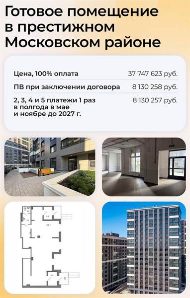 Помещение в рассрочку в жилом комплексе у метро Московские ворота. Площадь: 140,9 м2 – оптимальный размер для реализации разнообразных бизнес- идей Витринные окна: 3 витринных окна, обеспечивающих отличную видимость и привлечение клиентов Входы: 2 отдельных входа с тамбуром – удобство для посетителей и персонала, а также возможность разделения потоков Высота потолков: 3.34 м – позволяет использовать помещение для различных целей. Отличная локация: Гарантированный поток потенциальных клиентов. Пешая доступность до метро Развитая деловая зона: окружение офисов и бизнес-центров. Стоимость при 100 % оплате - 37 647 623 рубля. Уточняйте подробности.