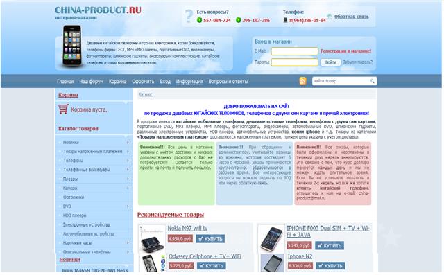 Интернет магазин по продаже дешевых китайских телефонов и прочей электроники, копии брендов iphone, телефонов фирмы CECT, MP4 и MP3 плееры, портативные DVD, видеокамеры, фотоаппараты, шпионские гаджеты, аксессуары и комплектующие. Передам всех поставщиков и постоянных клиентов! Все покажу, расскажу и в течении месяца-техподдержка с моей стороны