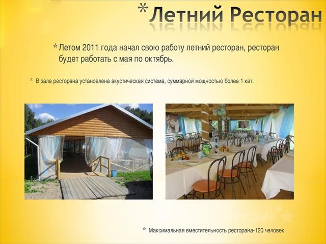 Выгодное предложение! Предлагается к продаже база отдыха на берегу озера, расположенная по адресу: Ленинградская область, Лодейнопольский район, Алеховщинское поселение, вблизи поселка Люговичи. Расстояние от г.Санкт-Петербург-240 км, от г. Лодейное поле-20км. Подъезд к базе осуществляется по федеральной трассе (М18) Санкт- Петербург - Мурманск (226-й км.), далее по дороге Р36 ( на Тихвин). База отдыха расположена на берегу Люговского озера, в экологически чистом заповедном крае, в центре "золотого треугольника" образованного тремя монастырями - Введено-Оятским, Свято-Троицким Александра Свирского и Покрово- Тервеническим. В окрестностях - уникальный Природный парк - "Вепсcкий лес" и Государственный Нижне-Свирский заповедник. Краткие характеристики объекта: * Год ввода объекта в эксплуатацию – декабрь 2005г. * Земельный участок – площадь 6,06 Га, категория земель: земли поселений, разрешенное использование: под базу отдыха. * Здания и сооружения – находятся в собственности. Все здания и сооружения комплекса выполнены в соответствии с проектом. * Электроснабжение – собственная комплектная трансформаторная подстанция, мощностью 600 кВа, разрешенная мощность- 400 кВа.,в качестве резервного источника питания используется автономная дизельная электростанция мощностью 100 кВа. * Водоснабжение – собственная артезианская скважина, глубиной 100 м. * Канализация – локальная-упоноры. * Отопление и горячее водоснабжение – в каждом здании установлены электроводонагреватели и стационарные электрические радиаторы, подогрев пола в с/узлах. Номерной фонд базы отдыха состоит из: * 4 больших коттеджей из оцлиндрованного бревна на две квартиры, со всеми удобствами, каждый площадью 109,3 м2 , рассчитанных на единовременное размещение до 10 человек в каждом. * 2 домиков в деревенском стиле из окоренного бревна, площадью 30,6 м2, рассчитанных на единовременное размещение до 4 человек в каждом. На территории имеется также 3 коттеджа и 4 домика, которые сданы, но не введенных на сегодняшний день в эксплуатацию. На территории базы отдыха также расположены: *Летний ресторан на 120 посадочных мест *Баня на дровах на берегу озера *Пирс *Горка для зимних развлечений *Детская площадка *Волейбольная площадка *Стоянка для автомобилей База отдыха функционирует круглый год, за время работы приобрела положительный имидж, имеет постоянную клиентскую базу. Особой популярностью у гостей пользуются - охота в сопровождении егеря,"тихая охота" (сбор грибов и ягод), форелевые пикники. 8962 714 68 45 Татьяна.