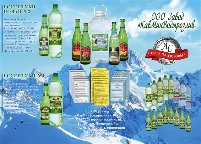 Продается завод по розливу минеральной воды в г. Ессентуки. 1. Завод располагается на территории 2,2 ГА (земля в собственности). 2. Оборудование в идеальном состоянии: — Линия розлива в ПЭТ бутылки – 7000 бутылок в час. — Линия розлива в стеклобутылки – 6000 бутылок в час. — Трансформаторная подстанция на 630 кВт в час — Углекислотная станция на 8000 кг. — Водоподготовка с емкостями – 155 т. 3. Капитальные здания: — по розливу – 1000 м² — склад готовой продукции – 1000 м² — административное здание – 120 м² — КПП Территория заасфальтирована. Начато строительство нового склада, имеются стройматериалы. 4. Автомашина - водовоз марки «Мерседес» с полуприцепом – 32, 5 т. для перевозки минеральной воды. 5. Автокар производства США - грузоподъемность 2, 5 т. 6. Выпускаемая продукция: — Минеральная вода Ессентуки «Новая» № 2, №4, №17 — Минеральная вода «Нагутская» №4, №17, №26 — Минеральная вода «Смирновская» — Минеральная вода «Славяновская» — А так же 2 вида родниковой воды На всю продукцию имеется вся необходимая документация (свидетельства, декларации и сертификаты). ЦЕНА ДОГОВОРНАЯ. Торг уместен. Возможна рассрочка платежа.