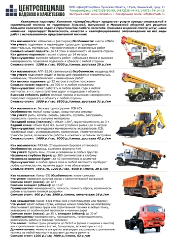 Продается отлаженный действующий бизнес по направлению «Услуги спецтехники». В собственности имеется следующая строительная техника: - автовышка АГП-22 на полноприводном шасси ЗИЛ-131 - буровая установка БКМ-302 на полноприводном шасси ГАЗ-66 - автокран «Ивановец» на шасси «МАЗ» (14 тонн/14 метров) - самосвал «Камаз» (с увеличенными бортами) - полноприводной тягач «Камаз» с полуприцепом и тралом-тяжеловозом Вся техника находится в полностью исправном и готовым к работе состоянии. Зарегистрирована на частное лицо, все документы в полном порядке. Переоформление техники со снятием с учета. Кроме самой техники, в цену продажи бизнеса входят: - разработанный и реально работающий интренет-сайт (www.csmash.ru); - рекламные модули в Тульских газетах, размещаемые на постоянной основе («Моя реклама», «Из рук в руки»), а также в 6 (шести) рекламных изданиях по Тульской области (Новомосковск, Заокск, Узловая, Алексин, Щекино, Ефремов), справочниках «Желтые страницы», «Авто71»; - полноцветные визитные карточки (постеры) для раздачи и размещения в магазинах (4000 шт.); - сим-карты Билайн с хорошо запоминающимися городскими номерами (используются для диспетчера) – 38-44-42 и 38-50-90 (с переоформлением на Вас); - все исходные материалы для сайта, данные для хостинга (с переоформлением на Вас) оригиналы объявлений, постеров и т.п.; - большой запас запасных частей и расходных материалов ко всей технике; - клиентская база (со всеми личными контактами ответственных лиц и руководства); - база данных строительных и смежных организаций по Туле и области для расширения клиентской базы; Дополнительно: - если необходимо, можем договориться о перезаключении договора аренды автобазы, где сейчас располагается техника, на Ханинском проезде, 11 (охраняемая территория, офис, все необходимое для ремонта и обслуживания парка техники). - если необходимо, опытные сотрудники (главный механик, крановщик, оператор автовышки, водители) готовы перейти на работу к новому работодателю. Полная стоимость всего комплекта: 3.700.000 руб. Чистая прибыль в месяц с учетом амортизации техники (зима): не менее 340.000 руб. Чистая прибыль в месяц с учетом амортизации техники (лето): не менее 480.000 руб. Причина продажи: необходимость вложения средств в коммерческую недвижимость (ввязались в стройку, но не рассчитали общий объем необходимых средств, а сроки сдачи подошли).