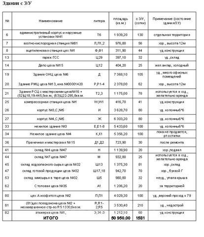Активы: Площадь земельного участка Категория земли – земли промышленности. Право собственности на все объекты недвижимости оформлено. Промплощадка имеет спокойный рельеф с уклоном планировочных плоскостей на северо-восток, северо-запад, юго-восток. Комплекс находится вне зоны жилой застройки Электроснабжение Питание предприятия осуществляется от ТП-51 «Оболенская» по восьми независимым кабельным вводам 6 кВ на каждую из 19-и подстанций. ТП-51 имеет два независимых ввода 110 кВ от энергосетей г. Новомосковска и г. Тулы. Питание цехов и участков осуществляется вводами 0,4 кВ подстанций. Системы двухвводного питания по 6 кВ обеспечены АВР на случай аварии (I категория электроснабжения). Присоединенная мощность-23 МВт. Газоснабжение К промплощадке подведен газ. Пропускная способность трубопровода – 408.000 куб.м. сутки. Водоснабжение На действует две системы водоснабжения: -хозяйственно-питьевое, -производственное. Для промышленных целей используется поверхностная (прудовая) вода из зарегулированного стока реки Липня притока реки Шат и артезианская (подземная) вода. Для хозяйственно-бытовых целей используется артезианская (подземная) вода. Подземная вода поступает в подземные коммуникации из заглубленных скважин закрытого типа. Разводка воды по территории предприятия выполнена подземными кольцевыми магистралями с запорной арматурой, пожарными гидрантами. Имеется производство деминерализованной и дистиллированной воды, а также её лабораторный контроль качества. Канализация Канализование сточных вод производится по сети промышленной и хозбытовой канализации. Хозбытовые сточные воды после механической очистки смешиваются с промышленными стоками и далее поступают на сооружения биологической очистки. Сточные воды предприятия, совместно со стоками поселка, проходят очистку на биологических очистных сооружениях проектной мощностью 11 тыс.м3 в сутки. Очистные сооружения эксплуатируются Производство азота и сжатого воздуха Азот производят на установке АДА-0,1 из атмосферного воздуха. Качество азота 99,999%. Давление азота 0,7-0,9 МПа. Азот используют в качестве средства пожаротушения и перемещения по трубопроводам жидких сред. Сжатие атмосферного воздуха производят компрессором 302 ВП 10/8. Давление сжатого воздуха до 0,8 МПа. Производительность компрессора 10 м3/мин. Сжатый воздух используют в технологии и для работы приборов КИП и А. Производство пара Для обеспечения производственных и бытовых нужд паром имеется котельный цех. Производительность котлов марки ДКВР-10/13 по пару 10 тн/ч и давлением 13 кгс/см2. Пар получают путем сжигания природного газа в топке котлов (ГРП). Снабжение природным газом осуществляется по подземному трубопроводу ду-320 мм, давлением до 3 кг/см2 Пар к потребителям поступает по эстакадам по стальным трубопроводам от 50 до 200 мм Имеет собственную микробиологическую лабораторию. Лицензия на работу с микроорганизмами IV группы патогенности и виварий. Возможны варианты аренды и продажи по частям.